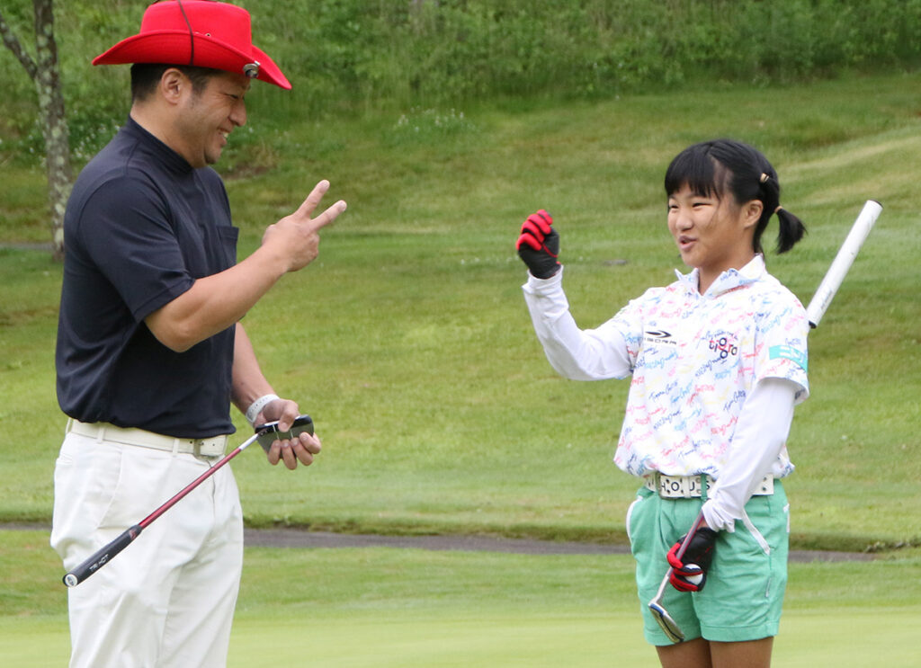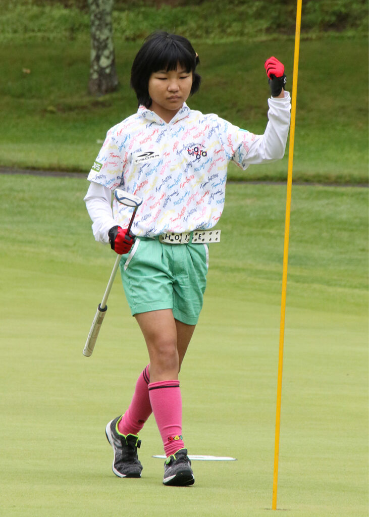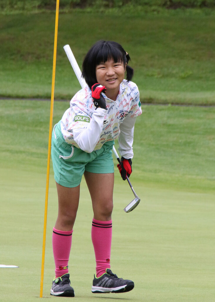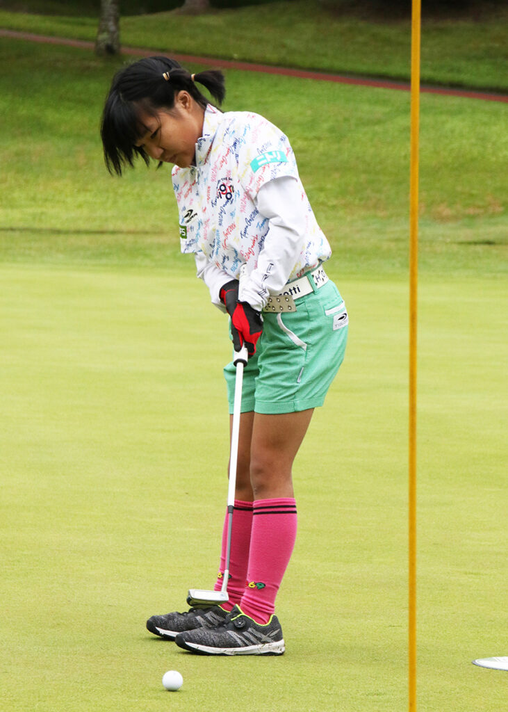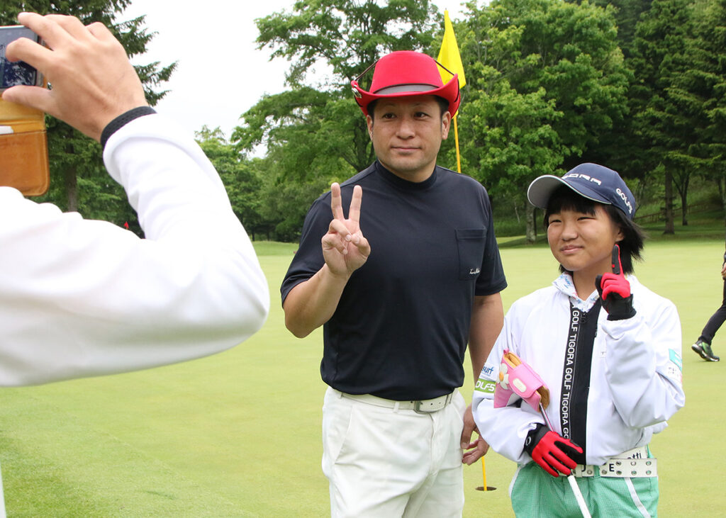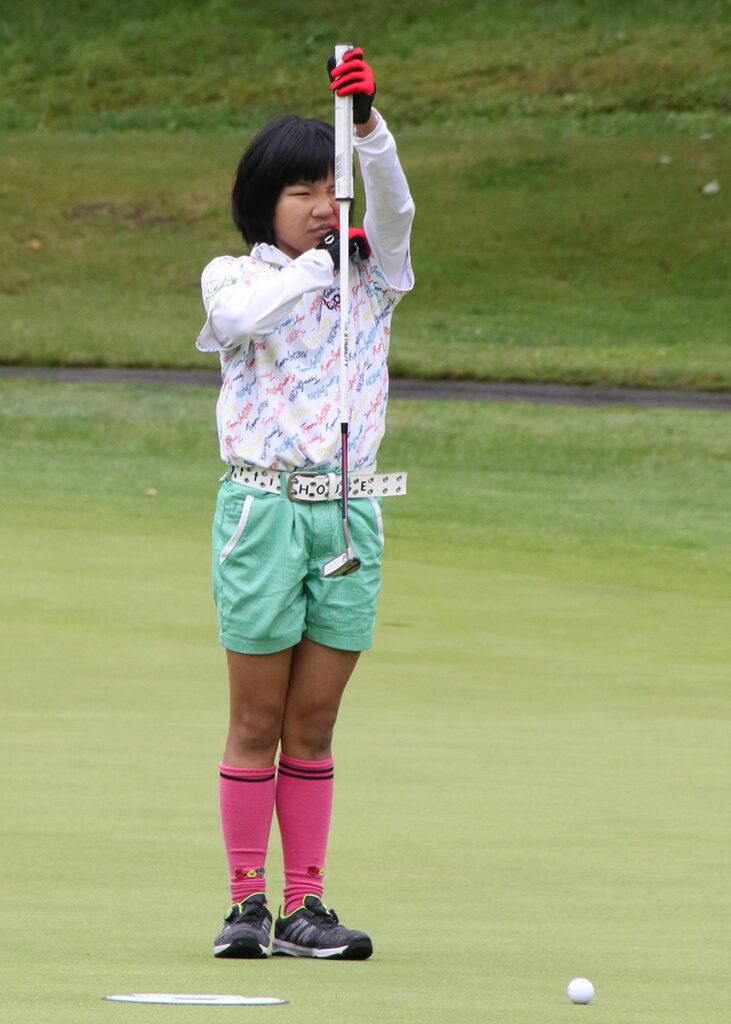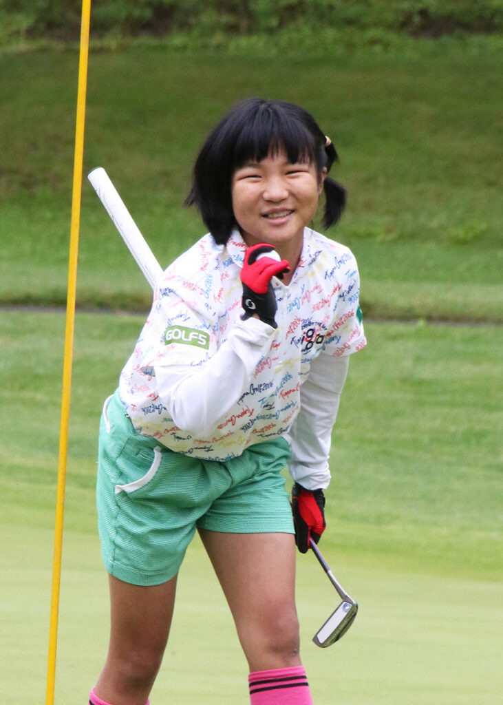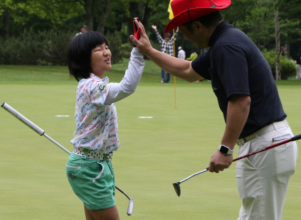 サドンデスの順番は、弥勒ちゃんがあいこの末、じゃんけんに勝って後攻をとりました。まず短めの8メートルぐらいのホール、先攻のyoshiakey選手がいきなりバーディー!弥勒ちゃん入れなければ、またもやファイナルに進んで優勝ならずです・・・。観客や参加者関係者は弥勒ちゃんは、また残念・・・と思ってたはずですが・・・なんと弥勒ちゃんもバーディーを取って最高の笑顔を見せてくれて、その瞬間を自分はカメラにパチリ!長年のスポーツ新聞カメラマンの勘、この流れは弥勒ちゃんでしょう!と確信。