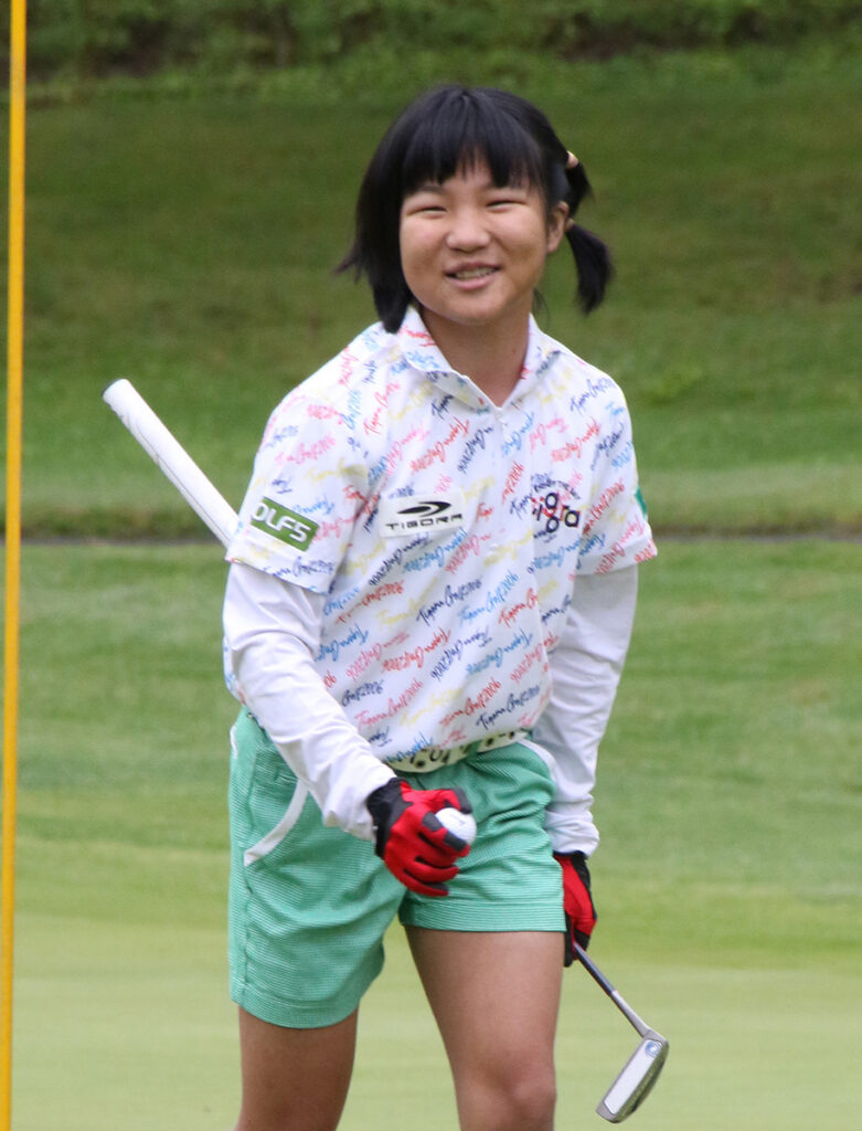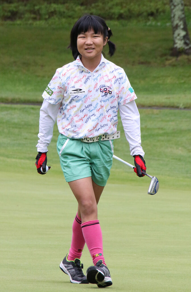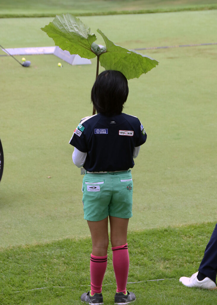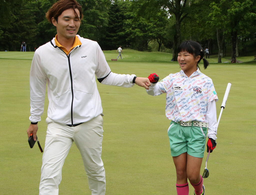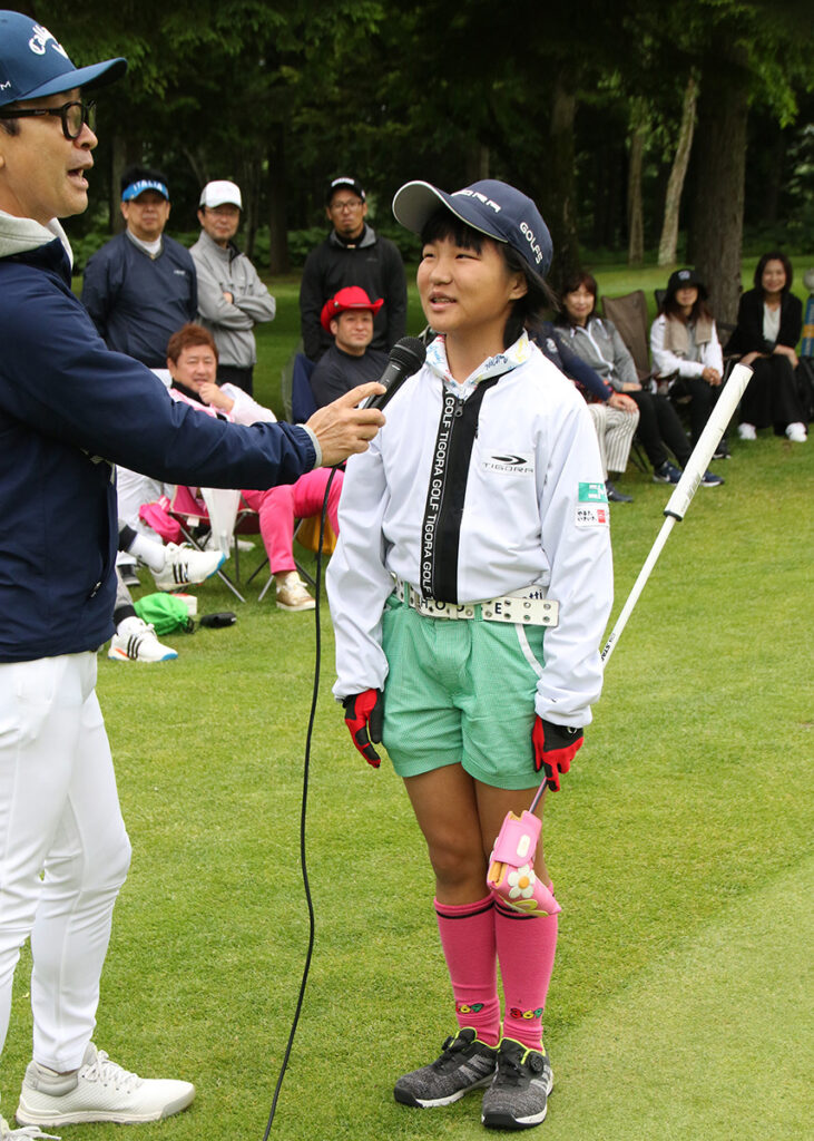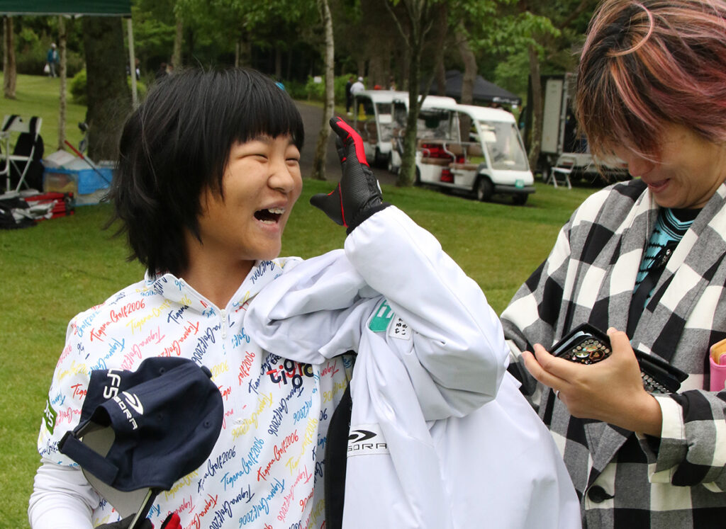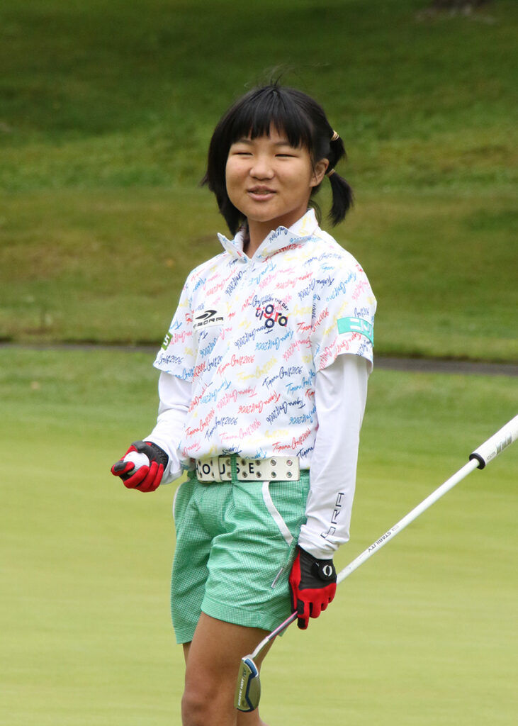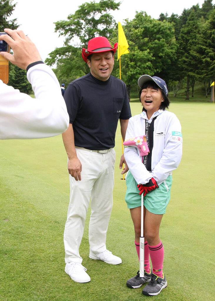 サドンデスの順番は、弥勒ちゃんがあいこの末、じゃんけんに勝って後攻をとりました。まず短めの8メートルぐらいのホール、先攻のyoshiakey選手がいきなりバーディー!弥勒ちゃん入れなければ、またもやファイナルに進んで優勝ならずです・・・。観客や参加者関係者は弥勒ちゃんは、また残念・・・と思ってたはずですが・・・なんと弥勒ちゃんもバーディーを取って最高の笑顔を見せてくれて、その瞬間を自分はカメラにパチリ!長年のスポーツ新聞カメラマンの勘、この流れは弥勒ちゃんでしょう!と確信。
